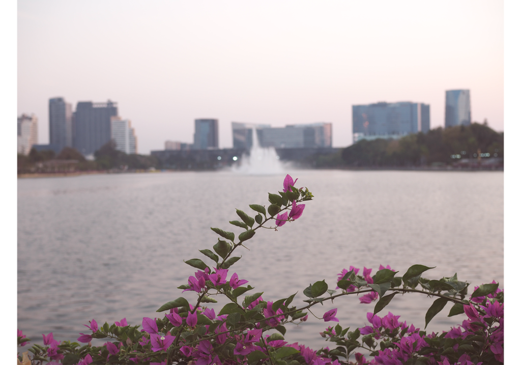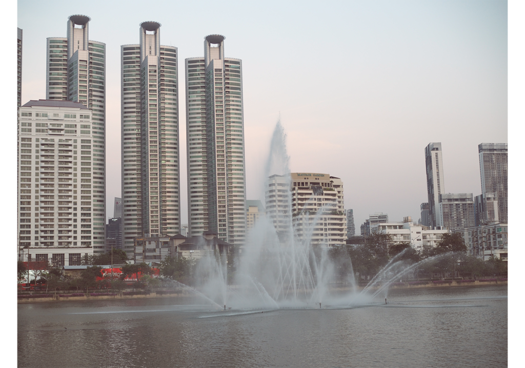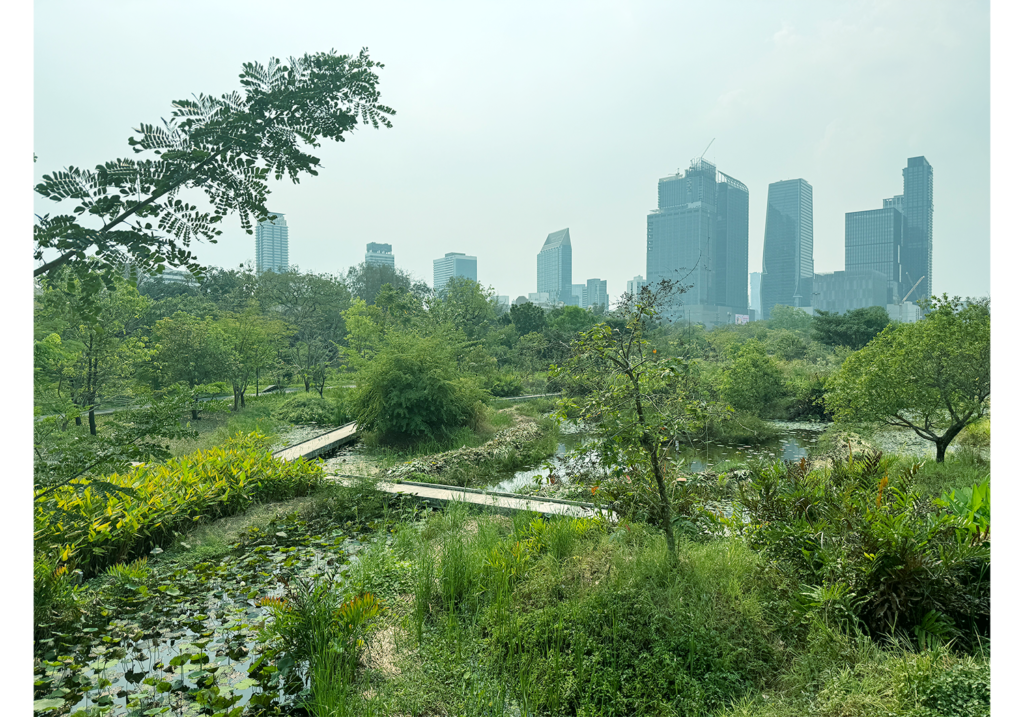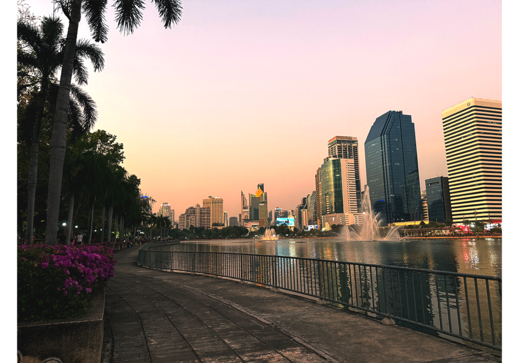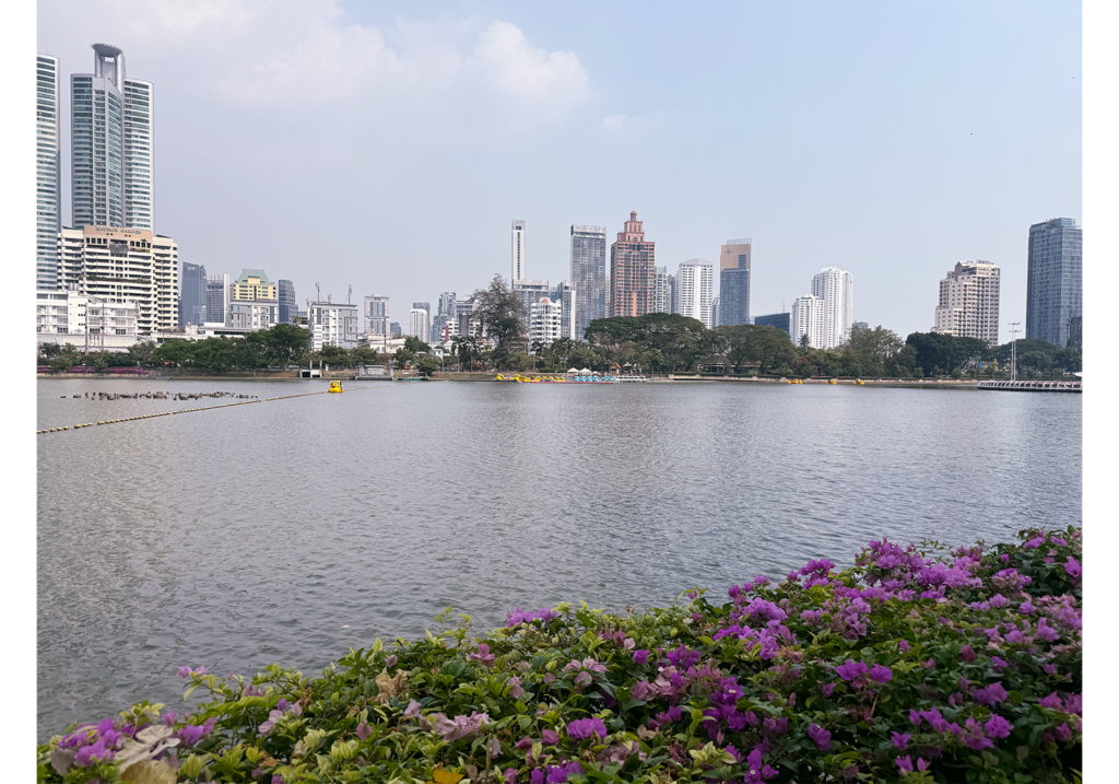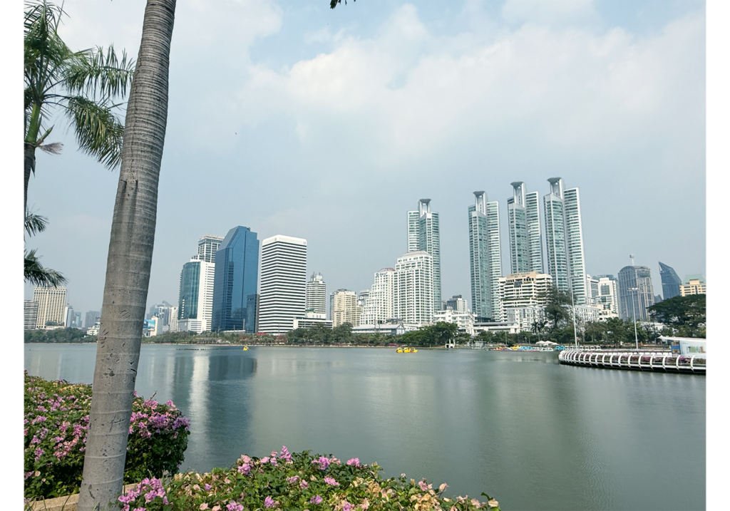 歩いていると、人工湖の向こうにバンコクの高層ビルが見えてきます。