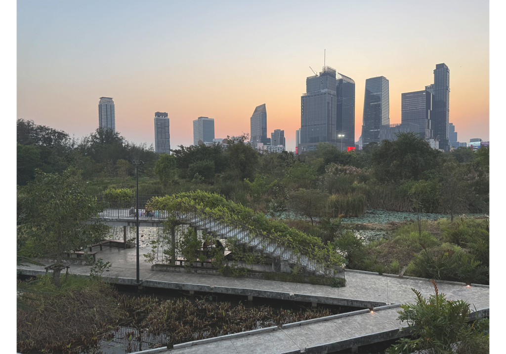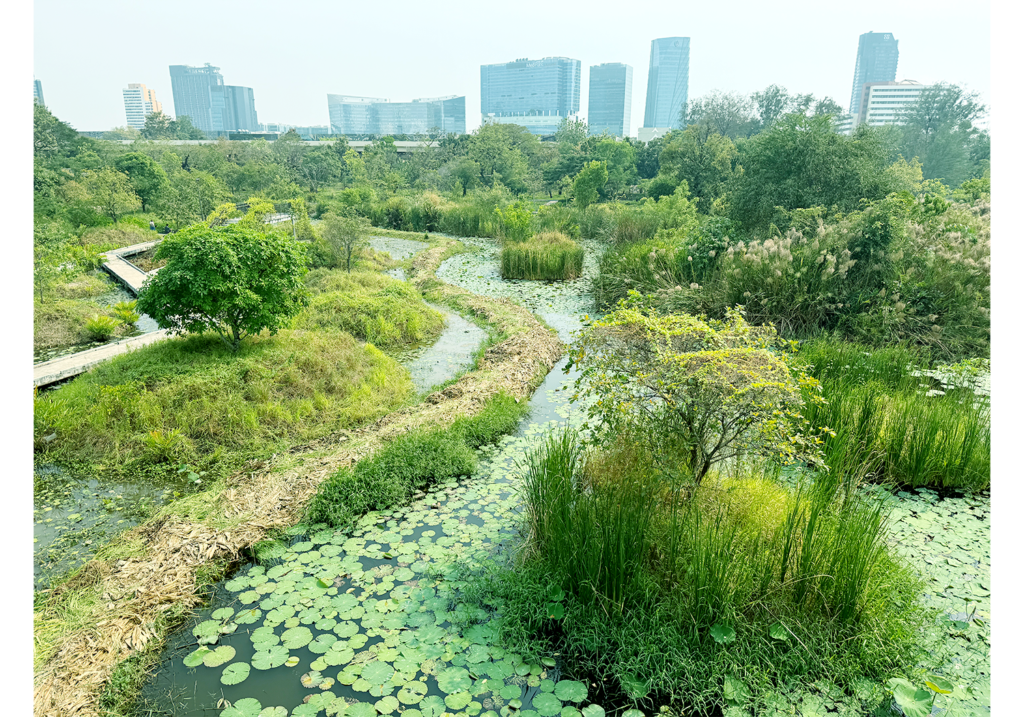 人工湖と高層ビルがつくる非日常の景色