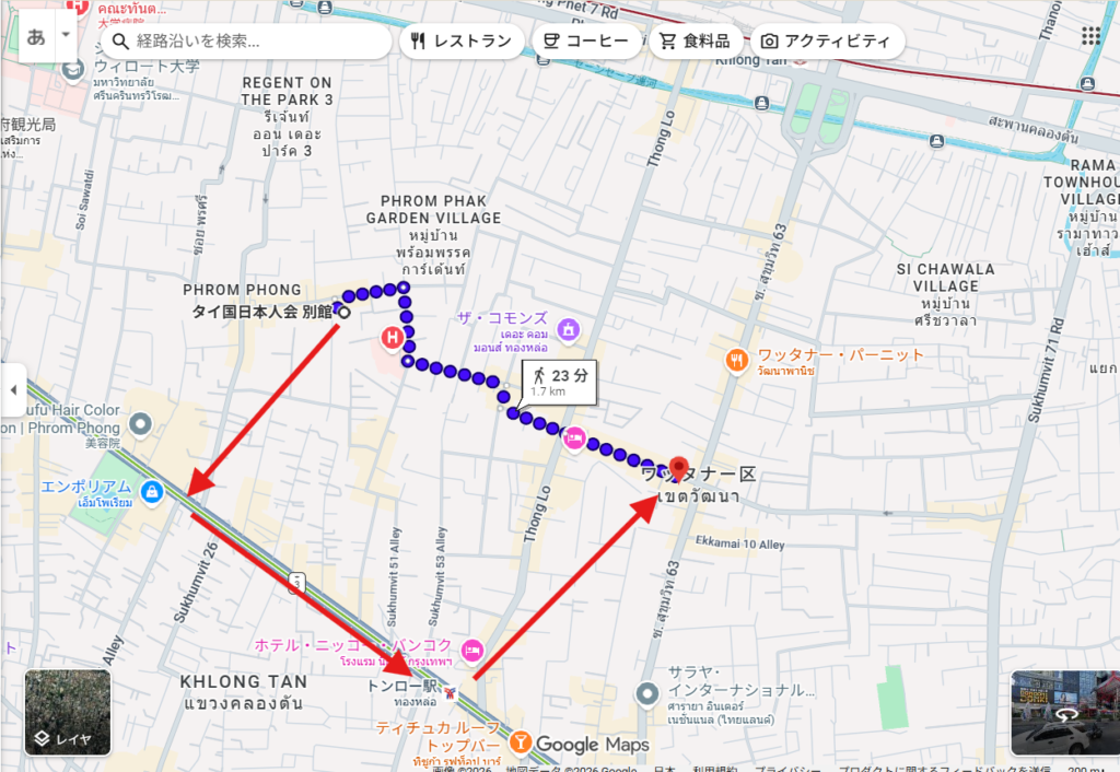 また、例えば画像のように日本人会別館からドンキに移動したい場合、BTSで行こうとすると赤い矢印ルートのようにまずはプロンポン駅まで行って、BTSで一駅先のトンロー駅に行ってからまた徒歩で移動するとなり、めちゃくちゃ時間がかかることも。