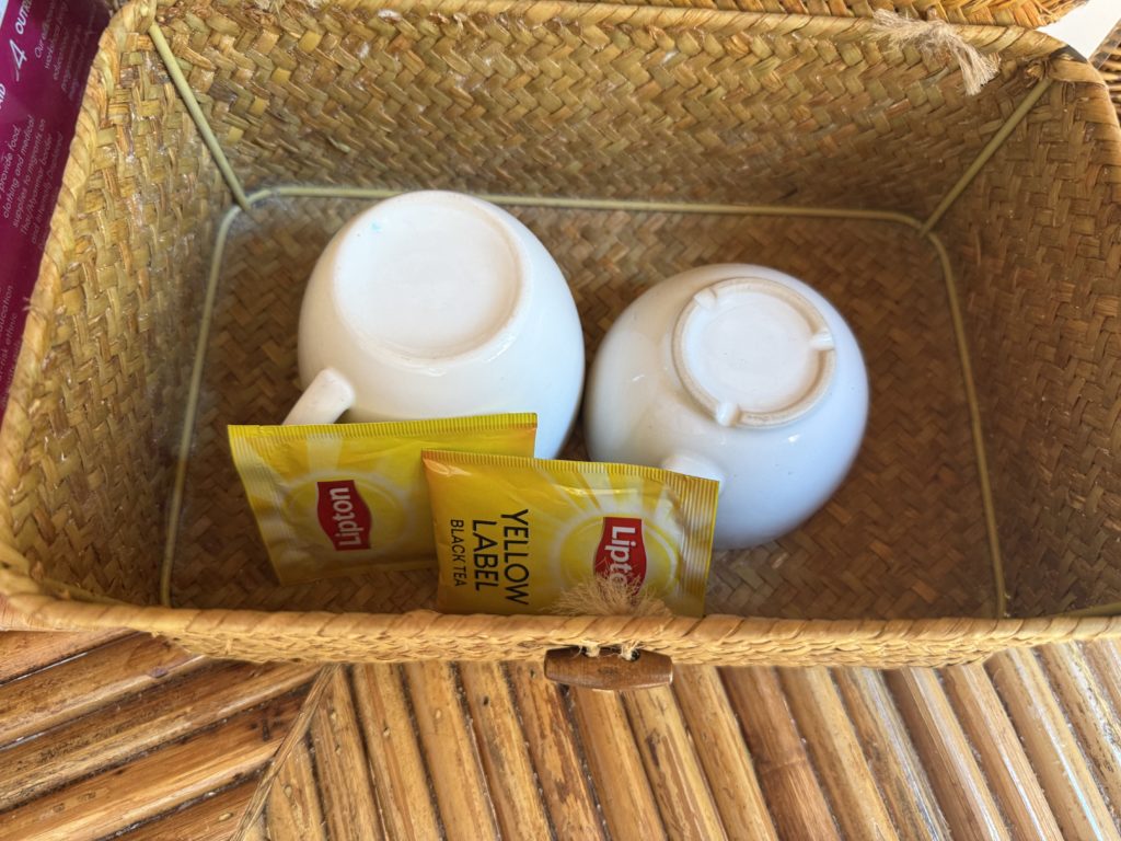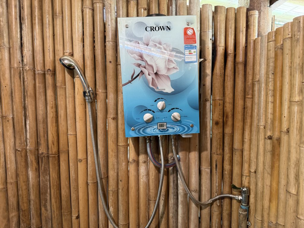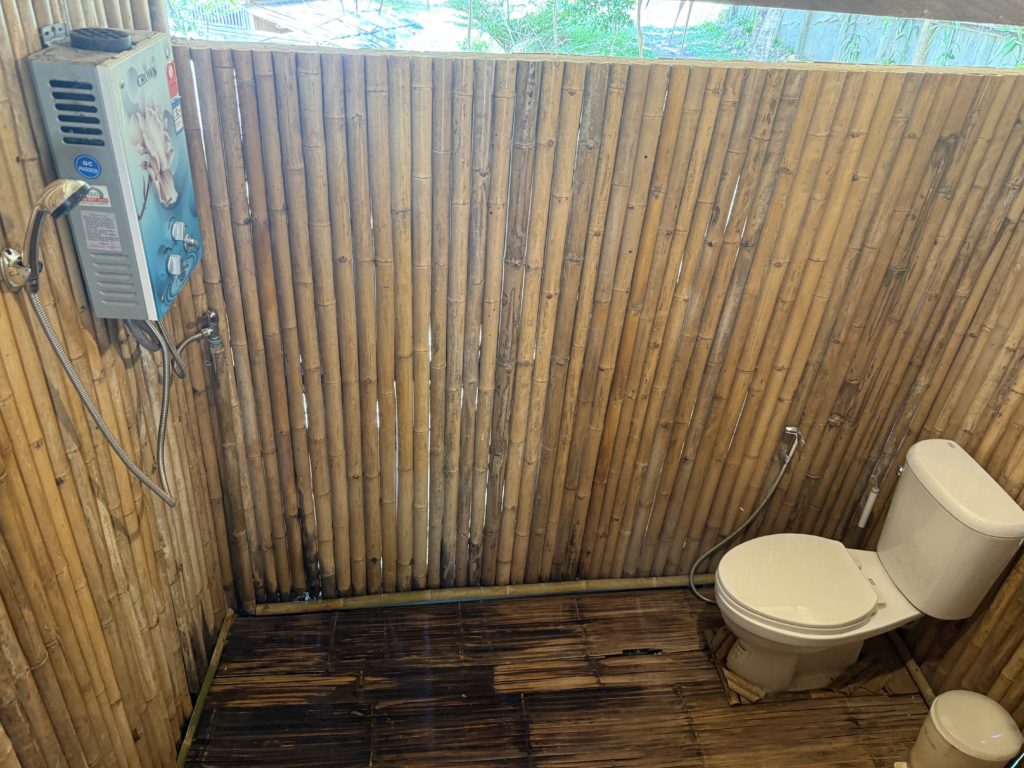 - あるもの: バスタオル、ドライヤー、ケトル、水2本、シャワー(シャンプー、ボディソープ、石鹸あり)、トイレ、マグカップ、ティーバッグ、虫よけスプレー